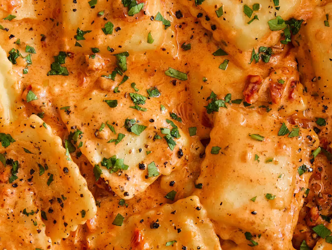 The sun-dried tomato sauce is really the thing that’s going to launch this recipe into your regular rotation and make it fancy enough to prepare for guests, too. Click HERE to see the instructions on how to put these ingredients together to achieve the ravioli beauty shown in the photo below, courtesy of the Damn Delicious website. Here’s the ingredient list: