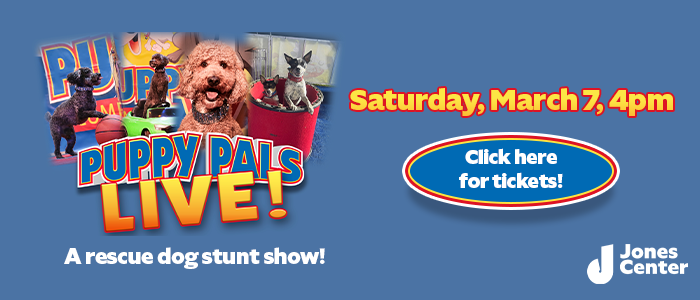 The Puppy Pals performance will happen at 4pm. These dogs are on a national tour visiting dog-lovers all over the country. Tickets are $15 each (or $12 each for Jones Center members). Here’s a sneak peek video of the show: